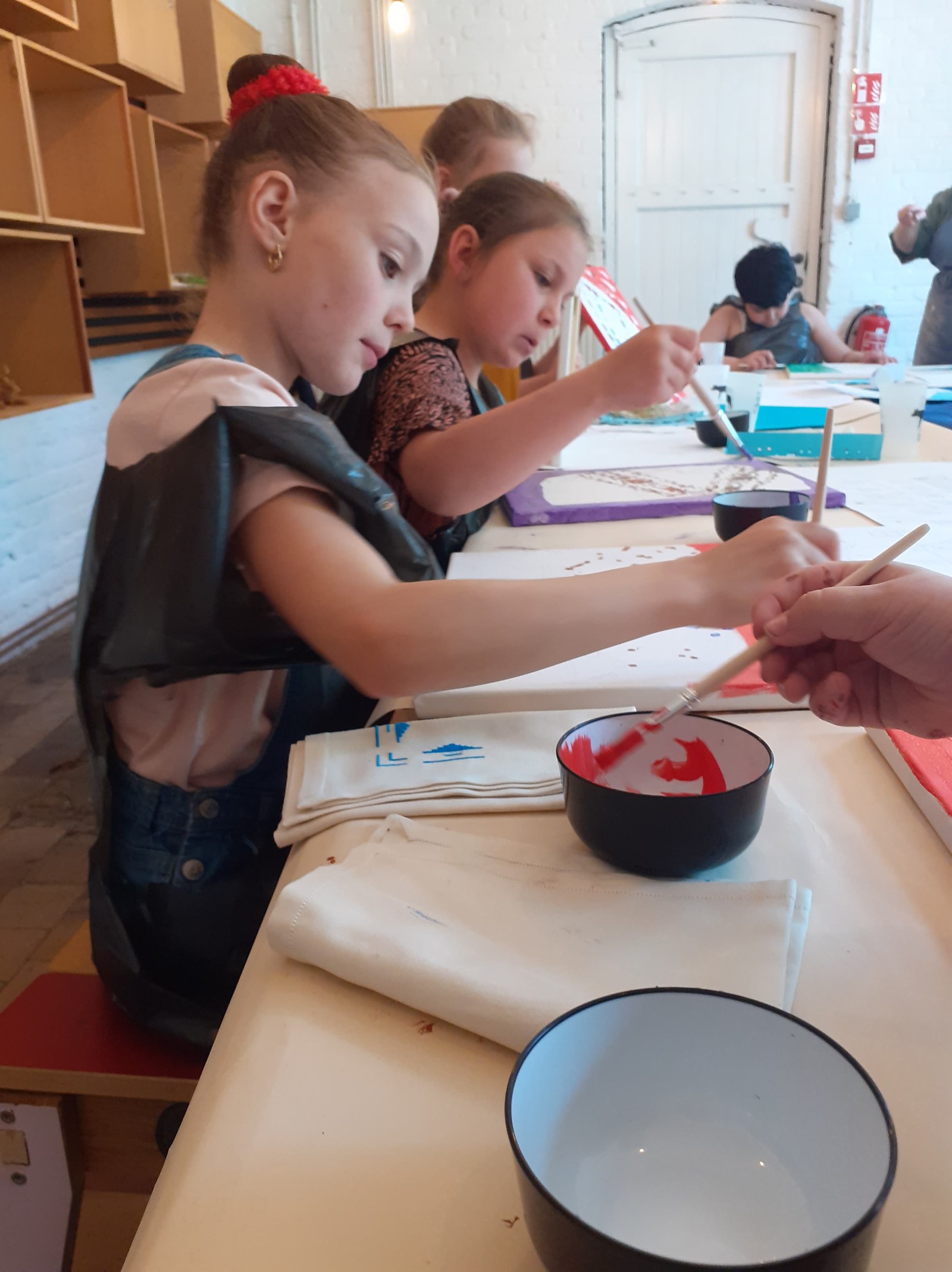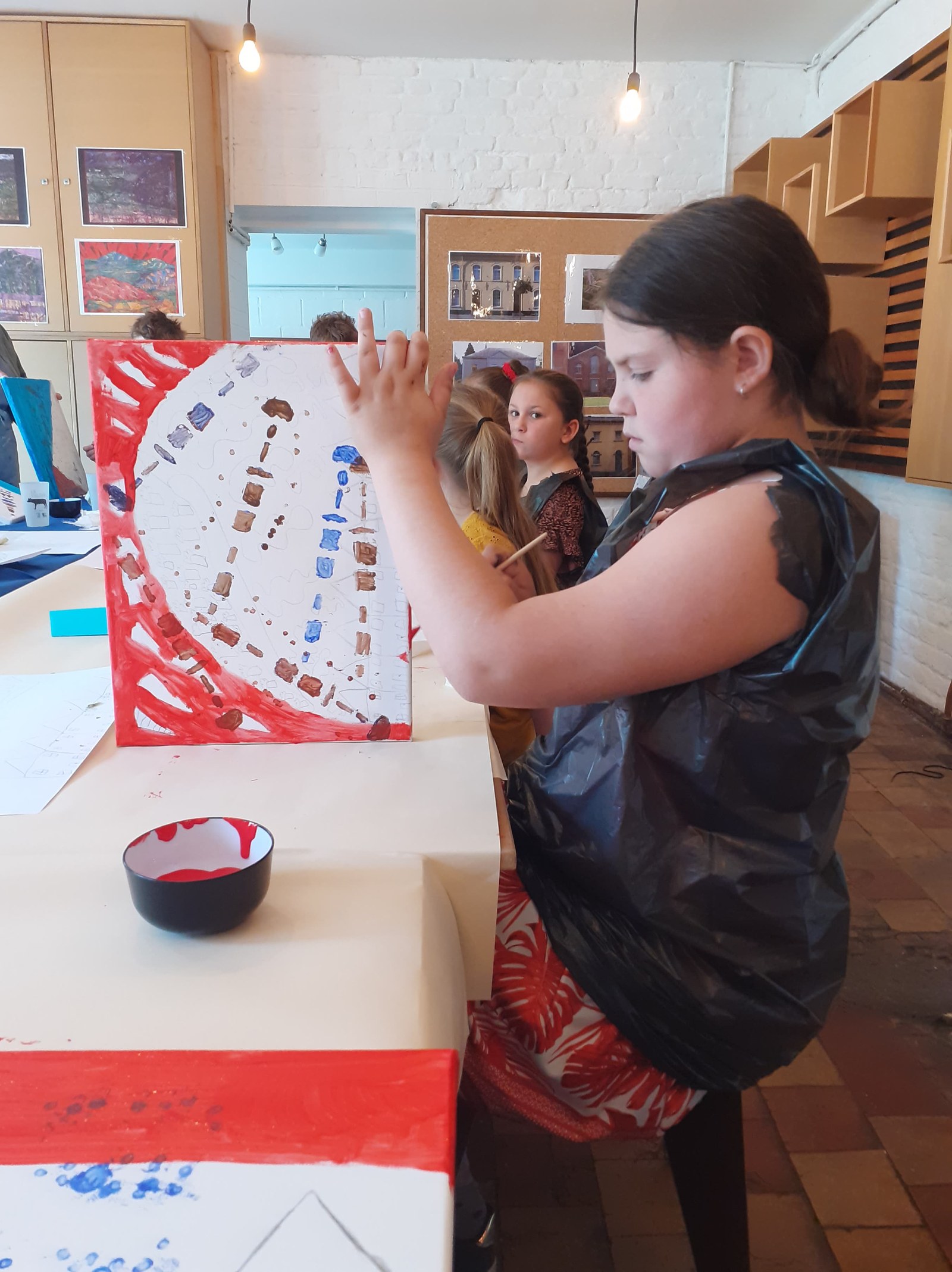 Installés dans le petit atelier pédagogique, les enfants sont étonnamment calmes et patients. L’environnement de bois upcyclé et de cocon à leur taille y serait-il pour quelque chose ? Françoise, l’animatrice, explique étape par étape la façon dont on va procéder. C’est très lent et posé et cela semble leur convenir. D’abord, dessiner l’esquisse sur papier – il faut au moins un terril, peut-être des maisons et un site industriel. Ensuite, la reproduire sur sa toile, que l’on a choisie carrée ou rectangulaire, sans trop appuyer sur la mine de crayon. Pas si simple que cela et certains y réussissent mieux que d’autres. Place à la peinture proprement dite. Pour le fond, il s’agit d’ »imiter » les circuits imprimés qui sont la marque de fabrique de Daniel Pelletti : on plie en deux des papiers, on coupe au milieu et on déplie, comme quand on faisait des petits napperons de dentelle. On utilise la perforatrice pour parsemer son pochoir de trous. Ensuite, on emballe tout le monde dans des sacs poubelle pour préserver les vêtements des taches d’acrylique. Le pochoir bien placé sur la toile – droit, de travers, en bas, en haut : comme on le souhaite -, on applique la peinture avec des cotons tige, certains la sèchent en tamponnant avec une éponge.