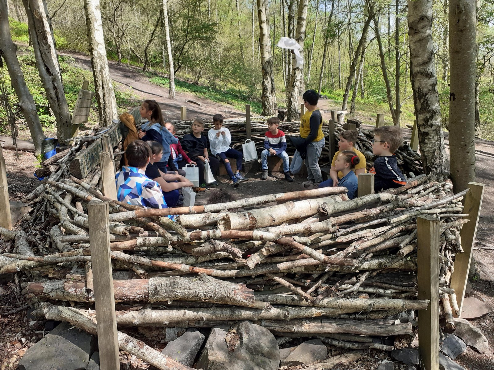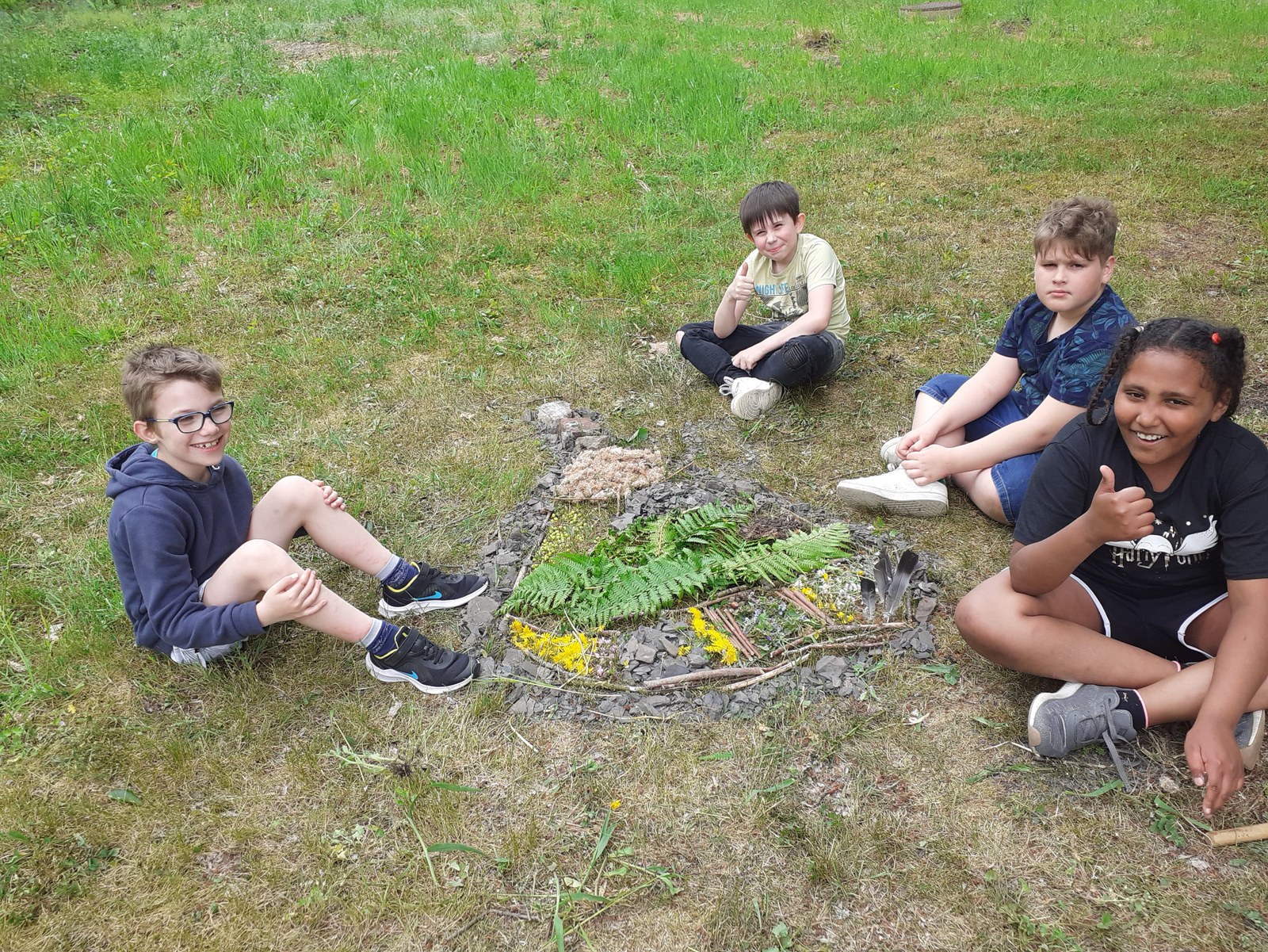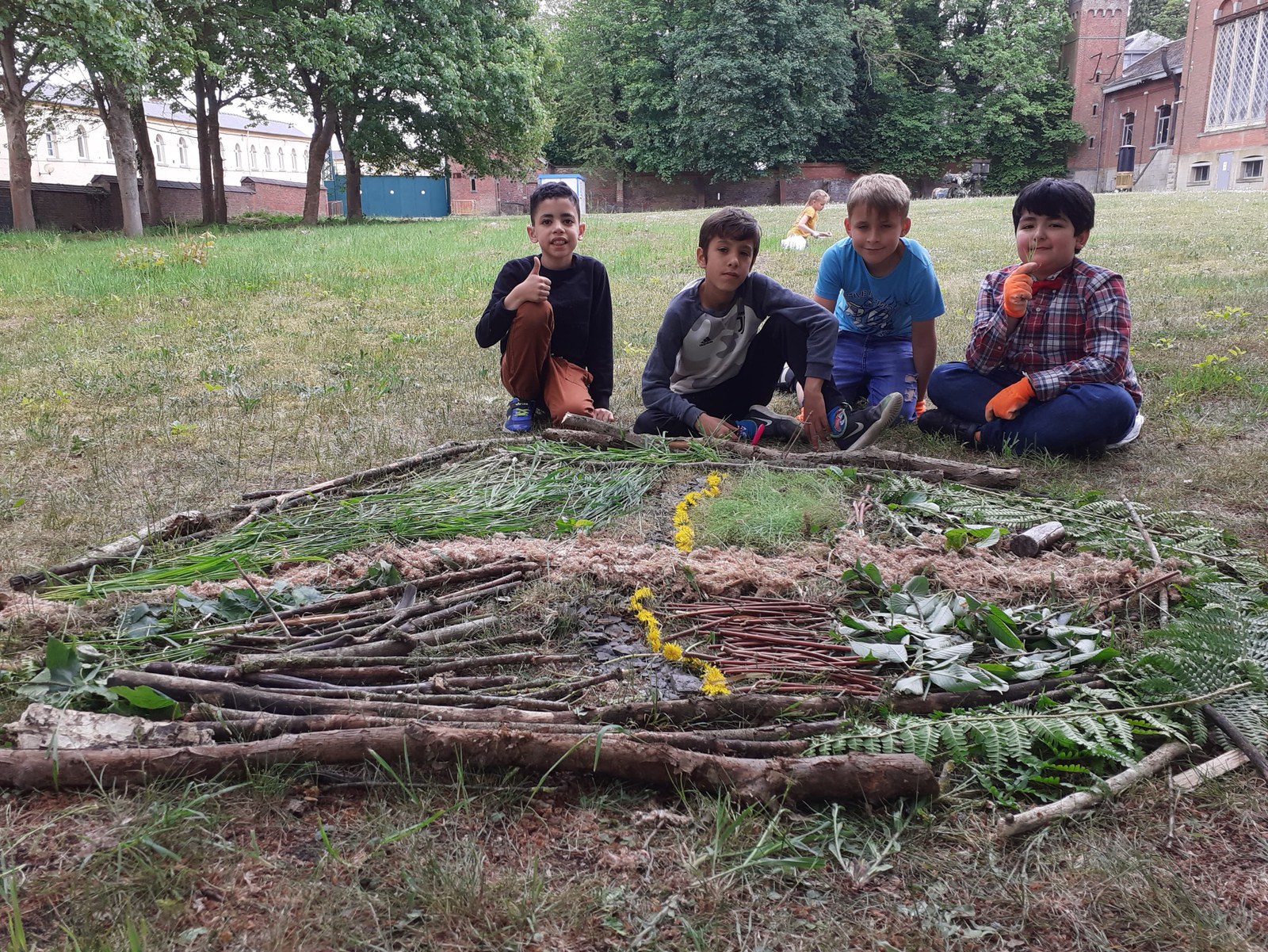 Après-midi, Françoise explique ce qu’est le land art : faire de l’art avec les éléments de la nature. Ici, bien sûr, on va essayer de représenter un terril ! Quelques règles pour collecter sans abîmer, et c’est parti ! En ce mois de mai, il y a vraiment beaucoup d’éléments intéressants : le jaune des boutons d’or et des pissenlits, le vert des cerises pas mûres (on a pu couper la branche parce qu’elle gênait), et de hautes herbes, le bleu des myosotis. Beaucoup de petit bois mort et le schiste rapporté du terril. On dirait que certains préfèrent la collecte que la création patiente de l’œuvre. Il faut travailler en équipe : le collectif est plus difficile que la création personnelle d’une œuvre. Les enfants se disputent un peu, il y a les meneurs, ceux qui ne se sentent pas écoutés, ceux qui rapportent beaucoup de choses mais ne prennent pas le temps de bien les disposer. Zakary ne prend que les chatons, Philippe va au-delà des limites données et revient les jambes remplies de piqûres d’orties. Et pourtant, ils continuent à tous retourner dans cette zone : l’appel du large !