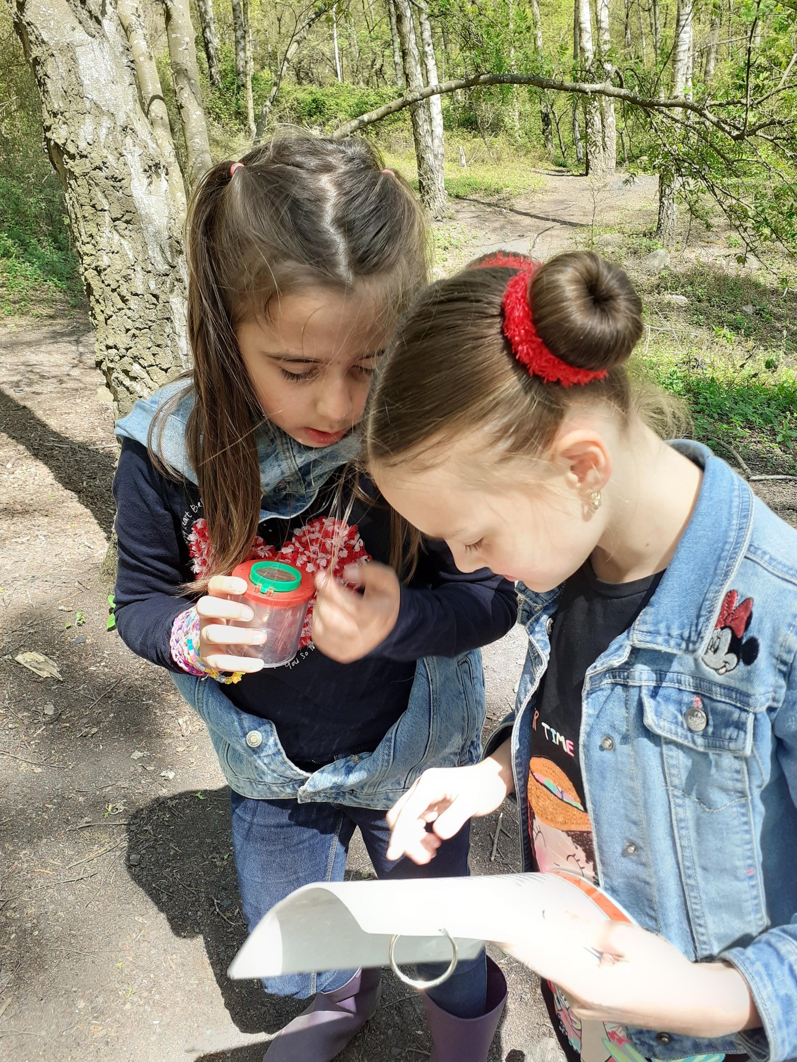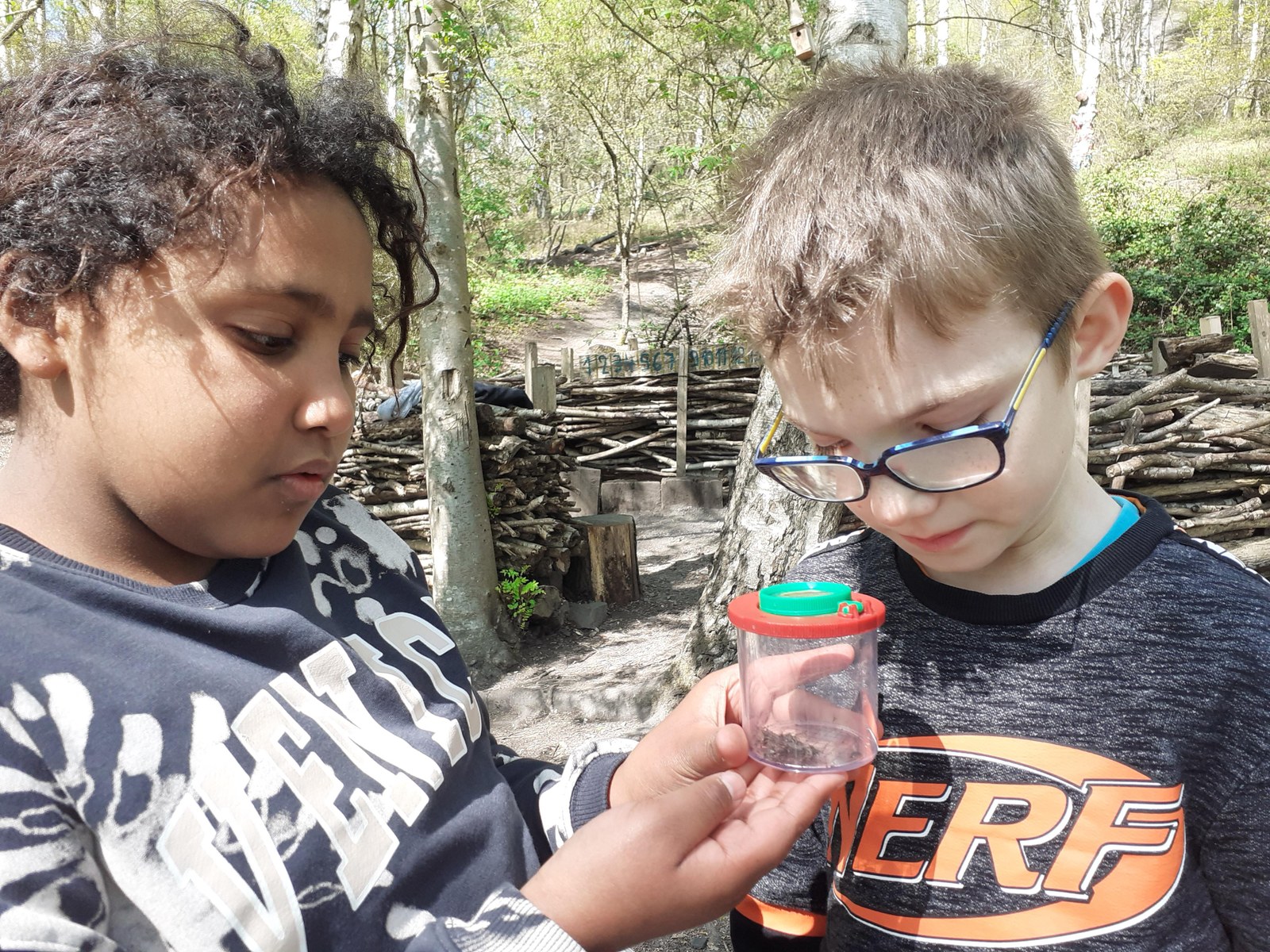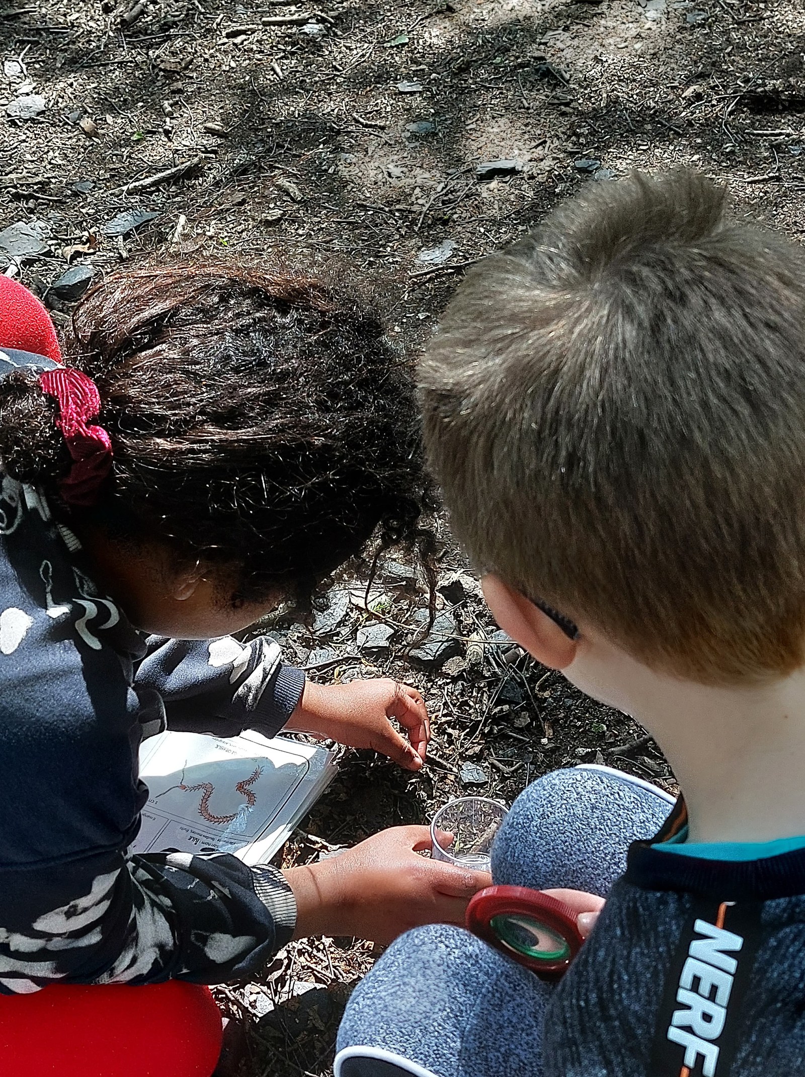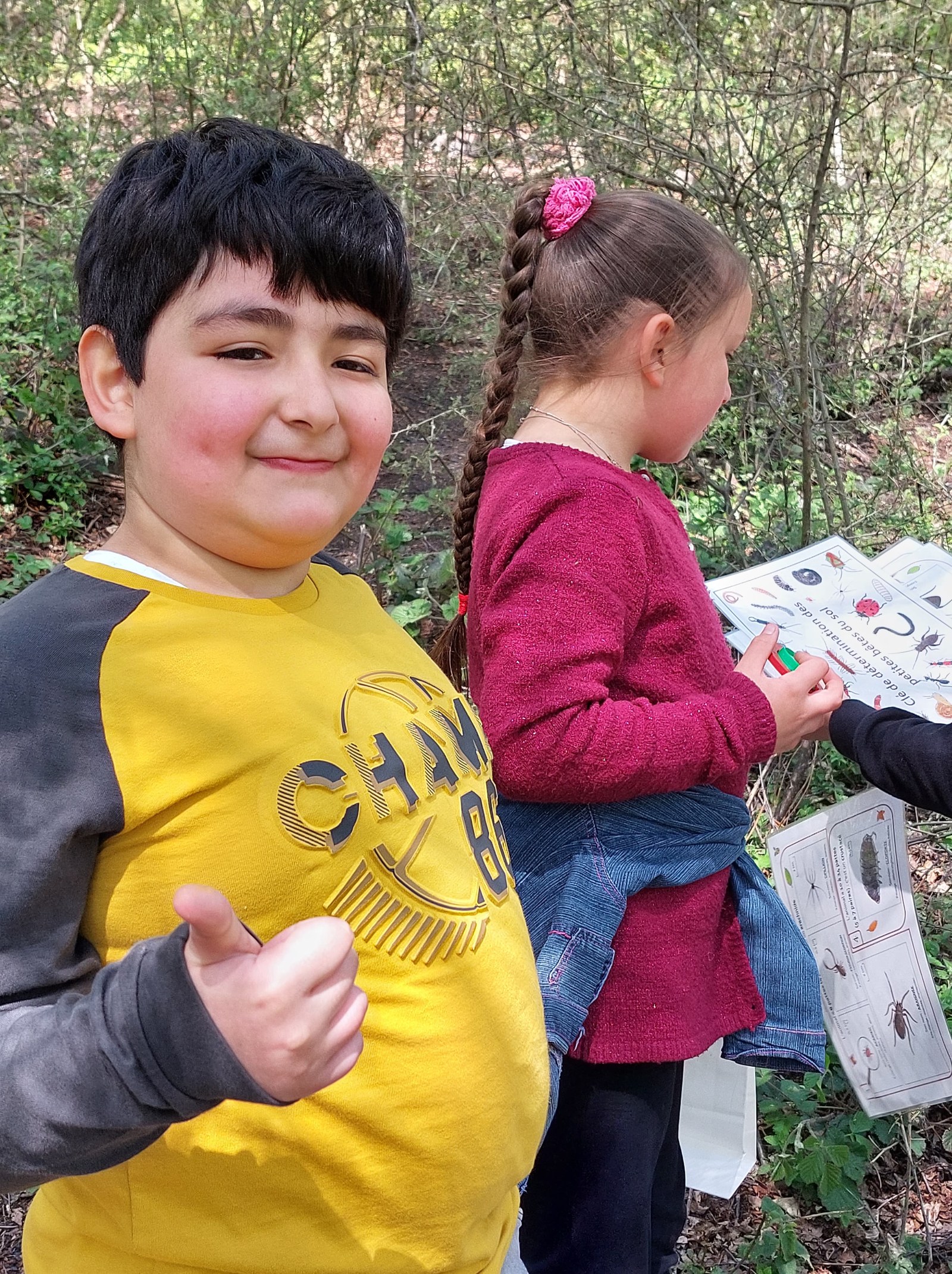 Le printemps est vraiment là ! La végétation est dense. « Avant, y avait pas d’arbre », dit Philippe. « Pas d’arbres ? Vraiment ? Précise un peu ce que tu veux dire… « Il n’y avait pas de feuilles sur les arbres, ils étaient tout nus ! ». On approche le terril par un autre côté que les deux premières fois, histoire de bien observer les changements de loin. Puis on se rapproche, et là, c’est toute une symphonie d’oiseaux qui nous accueillent : on s’en souvient, la première fois, en hiver, on avait à peine entendu deux oiseaux… Quelle joie d’être dans la nature, de pouvoir marcher ou courir à son rythme (enfin presque) ! On prend le chemin à la file indienne, on observe les schistes, le cerisier en fleurs -ce qui nous permet de nous rappeler la façon dont les graines se dispersent. Les oiseaux adorent les cerises !! Maëlyne passe la première et sursaute quand une tourterelle s’échappe d’un buisson à son arrivée : laquelle des deux a fait le plus peur à l’autre ? On se rend compte qu’on passe par le versant sud du terril : grâce au soleil et à la végétation. Puis on emprunte un chemin escarpé jusqu’au petit coin aménagé par l’école du dehors : aujourd’hui, c’est à nous de faire l’école dehors ! On s’assied en cercle sur les rondins de bois. Première mission : observer les petites bêtes au sol après les avoir attrapées délicatement et à l’aide de la clé de détermination. On soulève de vieilles souches ou des pierres : quel grouillement !! Beaucoup de cloportes, quelques chenilles qui avancent en se tortillant. Pas facile de compter le nombre de pattes tellement les animaux bougent ! Ensuite, on étale un grand papier blanc au sol et on secoue la branche juste au-dessus : quelques petites bêtes qu’abritait l’arbre y tombent… Philippe a peur des petites bêtes et participe peu à l’activité, même si Maelys essaie de l’entraîner.