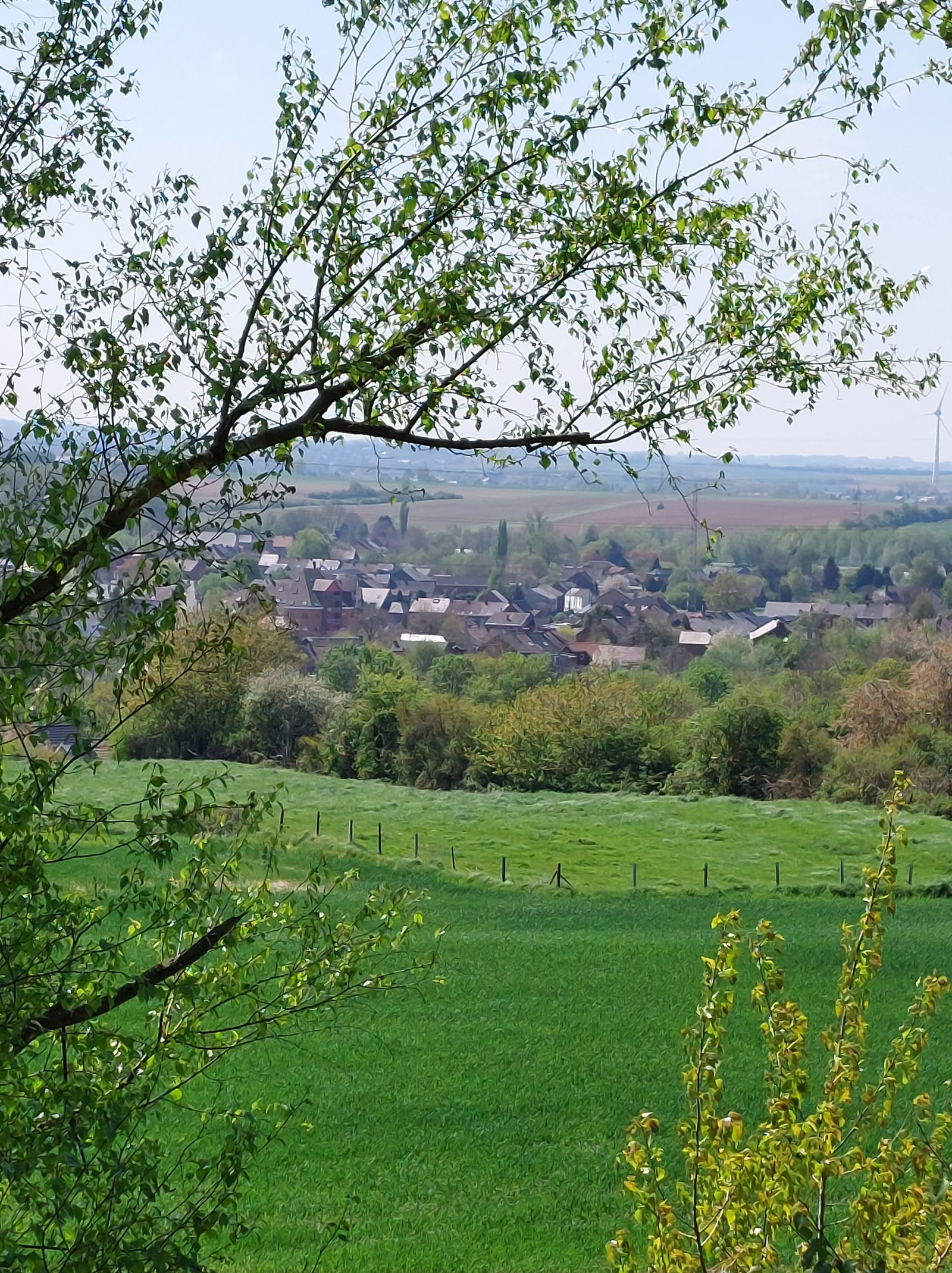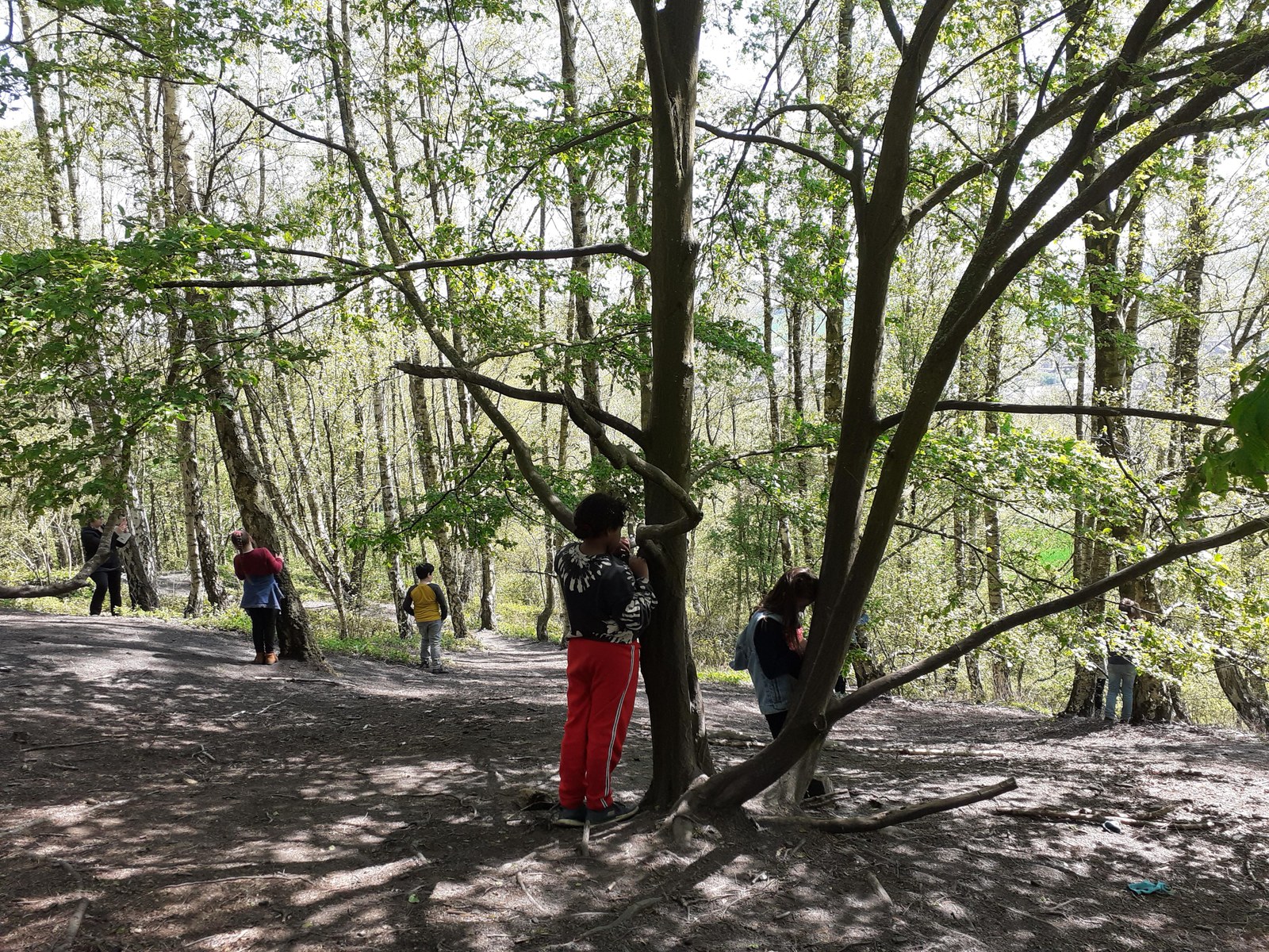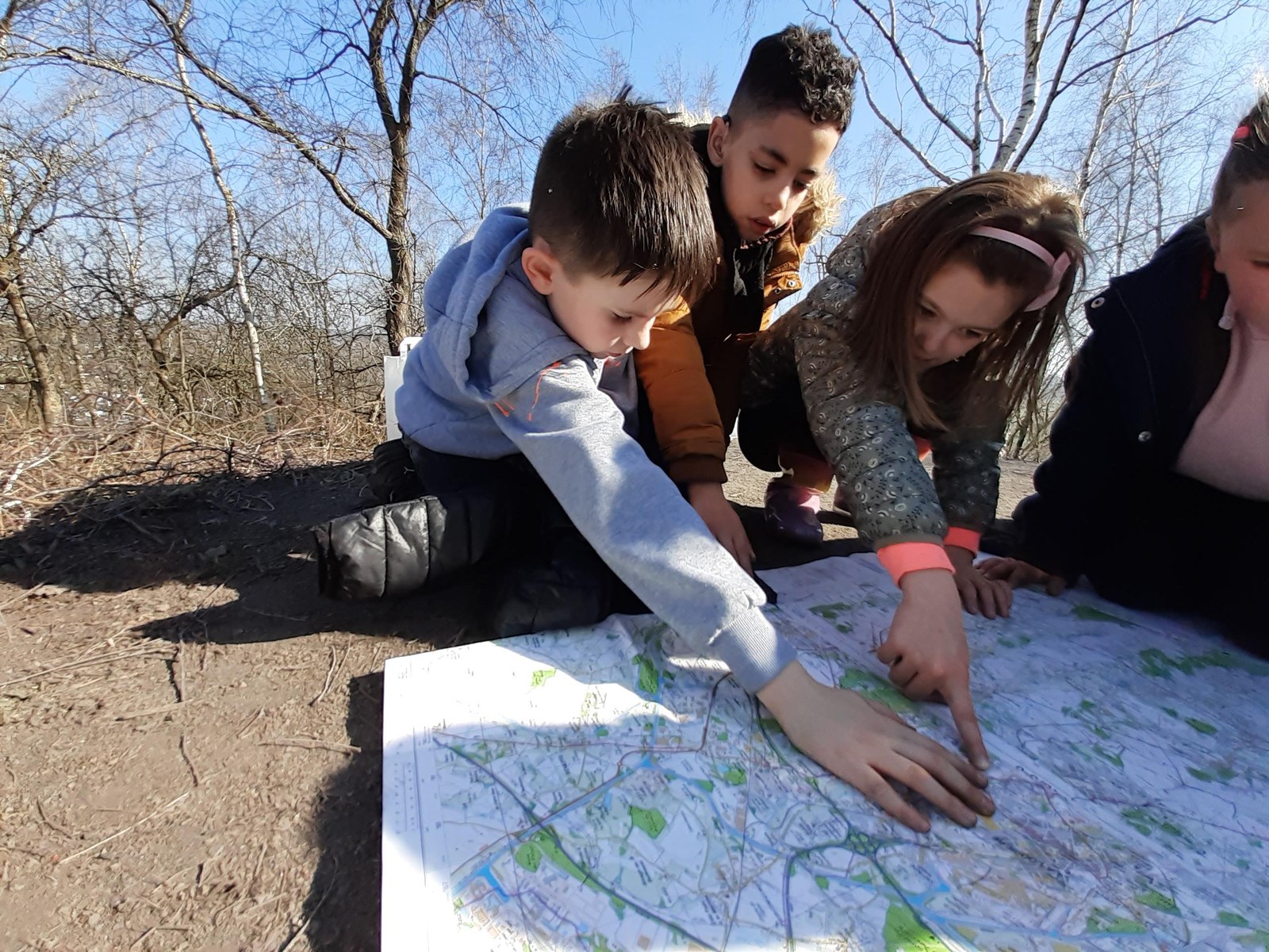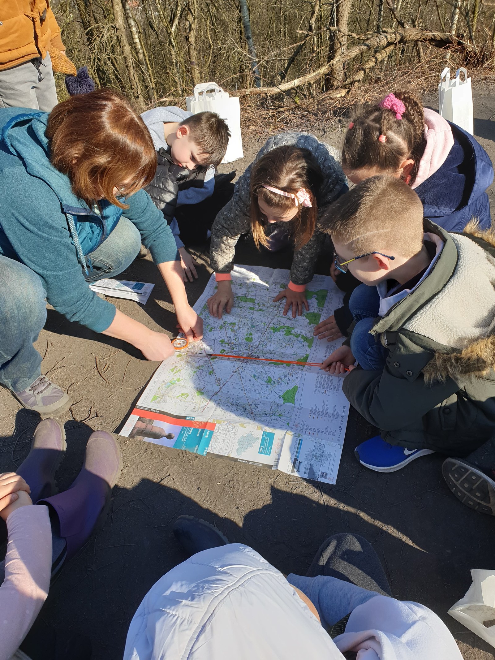 Après-midi, c’est sur le terrain que les petits explorateurs vont s’exercer à l’orientation ! On n’emporte plus que les cartes IGN - celle de La Louvière et celle de Binche, puisque le terril Albert 1er est juste à la jonction des deux – et on fait une première halte « orientation » au château d’eau. Pas facile de se repérer ! On monte ensuite jusqu’au belvédère pour observer enfin le paysage caché par le brouillard lors de notre première montée. On compte les terrils, les éoliennes, on cherche après une voiture blanche, une vache, une église ; on situe l’horizon, l’avant-plan, le plan moyen et l’arrière-plan. On oriente à nouveau les cartes, et on recommencera une dernière fois au sommet. A plusieurs reprises aussi, on ferme les yeux pour écouter les sons autour de nous : la nature est un peu plus réveillée que la première fois : il y a plus d’oiseaux. On entend beaucoup les voitures, mais aussi un avion, le marchand de glace, le vent dans les arbres et la cloche de l’église.