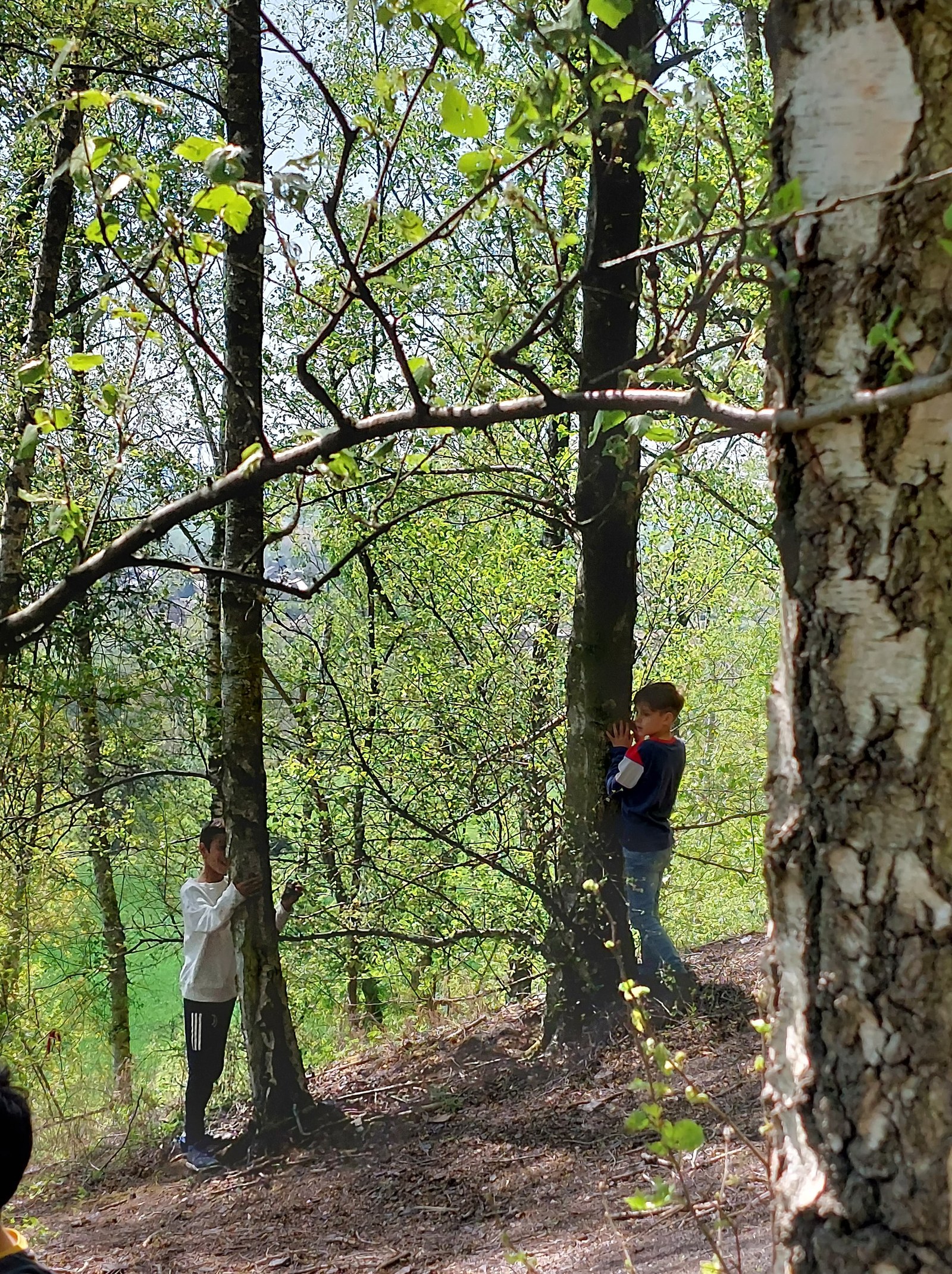 Et maintenant, on se recentre : chacun choisit un arbre, l’entoure de ses bras, pose son front contre son écorce, ferme les yeux. Et imagine son histoire. Au début, certains font les clowns… Ce n’est pas dans leurs habitudes de se poser calmement contre un arbre… Je fais semblant de rien, je poursuis mes propositions pour faire voyager leur imagination, et petit à petit tous entrent dans la danse… Au retour, je propose à ceux qui le veulent de raconter l’histoire de leur arbre. Deux candidats seulement. « Je crois que mon arbre est vieux, il aime quand il pleut, car il ne veut pas avoir soif ». « Je crois aussi que mon arbre a au moins 67 ans, mais lui il aime l’été, quand il y a beaucoup de feuilles, qu’il se fait beau ». « Mais il se fait beau pour qui ? « Les autres arbres, les humains qui se promènent ». Peu à peu, d’autres veulent raconter leurs histoires aussi. « Mon arbre a le tronc lisse, il a 8 ans. » « Comme toi ? « « Oui, il abrite des oiseaux et des petites bêtes ». « Mon arbre a trop de mousse, il voudrait une saison où il n’y a pas de mousse ». Alessio rigole en disant qu’il a une histoire ; il a sans doute peur qu’on se moque de lui, c’est quoi ces histoires d’arbres qui ont une vie ?? Son frère rigole aussi et répète la même histoire.