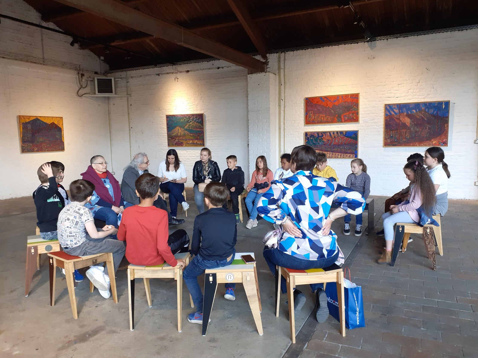 Quand ils ont représenté leur terril, chaque dessin était différent. Car chacun a vécu à sa façon ces découvertes et les as transposées dans son imaginaire. Maëlyne, Zakary, Lenny, Nour, Maelys, Alessio, Aurelio, Philippe, Maelys, Alex, Klécia, Alparslan, Nathalie, Céléna et Gianna : tous étaient prêts pour découvrir comment un artiste interprétait ces paysages issus des charbonnages. Les couleurs vives, les formes géométriques, les structures étranges des tableaux de Daniel Pelletti les ont émerveillés. Ils en ont eu, des questions à lui poser, à cet homme, connu par-delà les frontières… et qui habite pourtant la maison juste à côté de leur école !