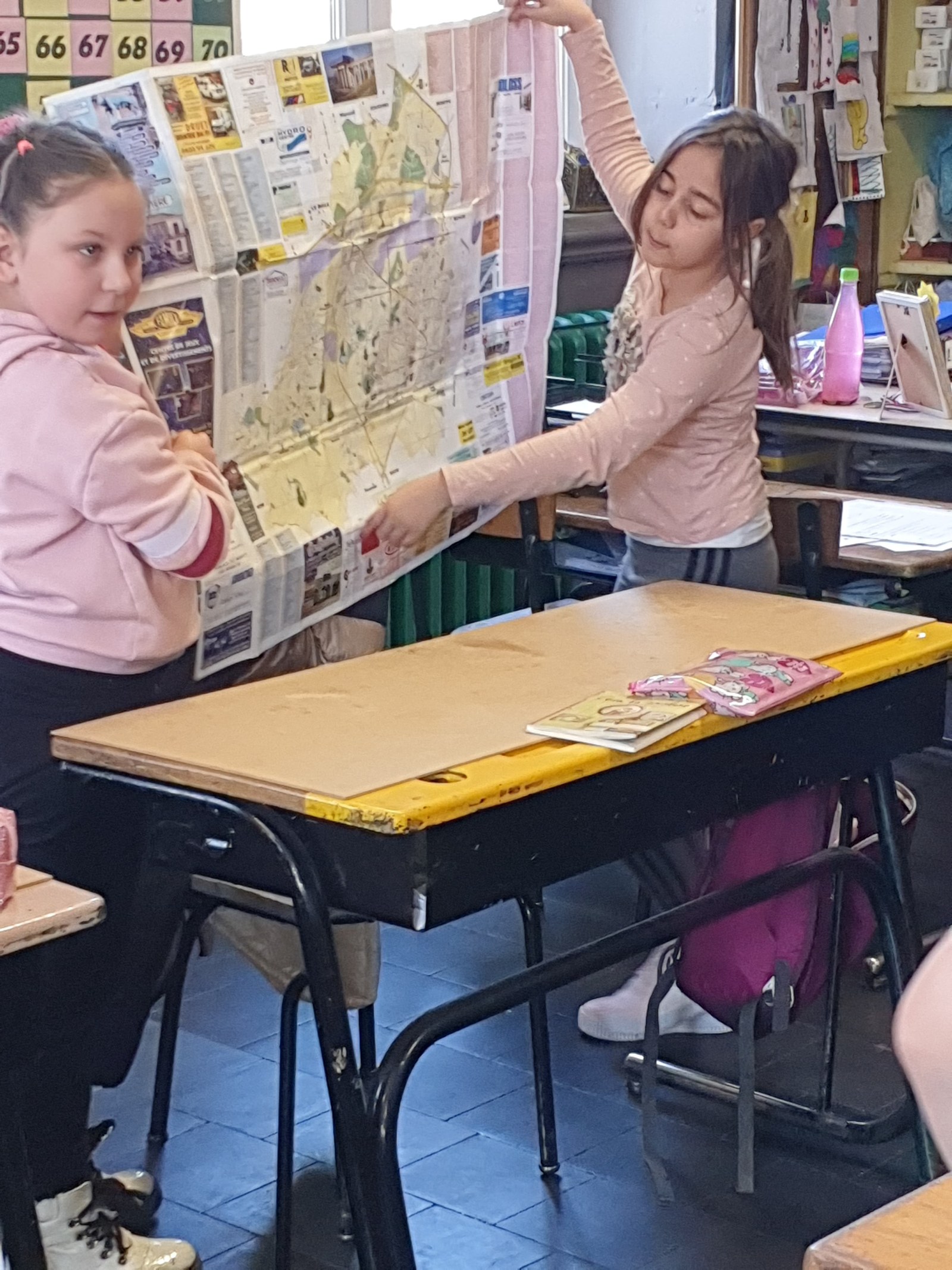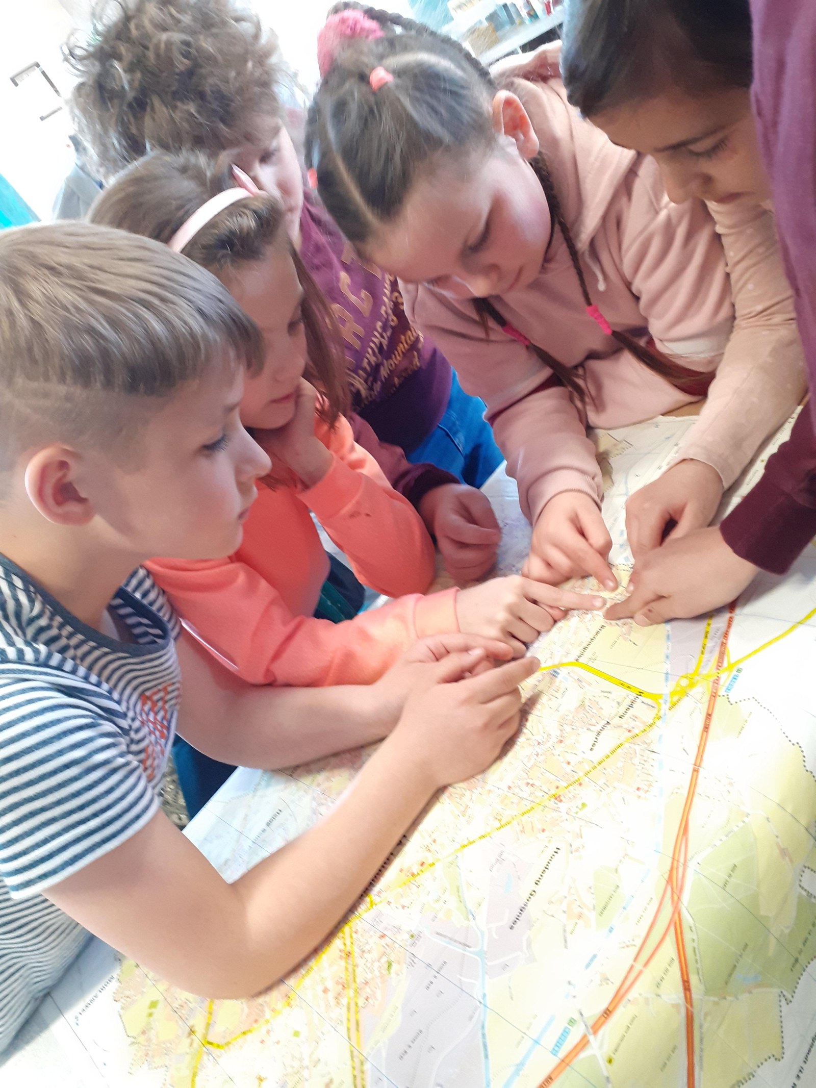 Ce matin, on a découvert en classe comment trouver son chemin :  à l’aide d’un gps quand on part en voiture avec les parents (eh non, un gps, ce n’est pas de la magie : quand il nous montre le chemin, c’est grâce aux satellites ! ). « Dans la voiture de ma tante, il n’y a pas de gps, alors on prend une carte ! » Chaque groupe reçoit un type de carte différent : carte routière, carte topographique, plan de ville ; chacune a son utilité. On repère l’école : le plus facile est de trouver un indice qui peut nous aider. L’église en face de l’école, ce sera parfait : il suffit de chercher une croix ! Puis on trouve les « carrés de Bois-du-Luc ». Le dessus de la carte étant toujours au Nord, on tourne les cartes jusqu’à trouver la bonne orientation, puis on vérifie avec les boussoles !