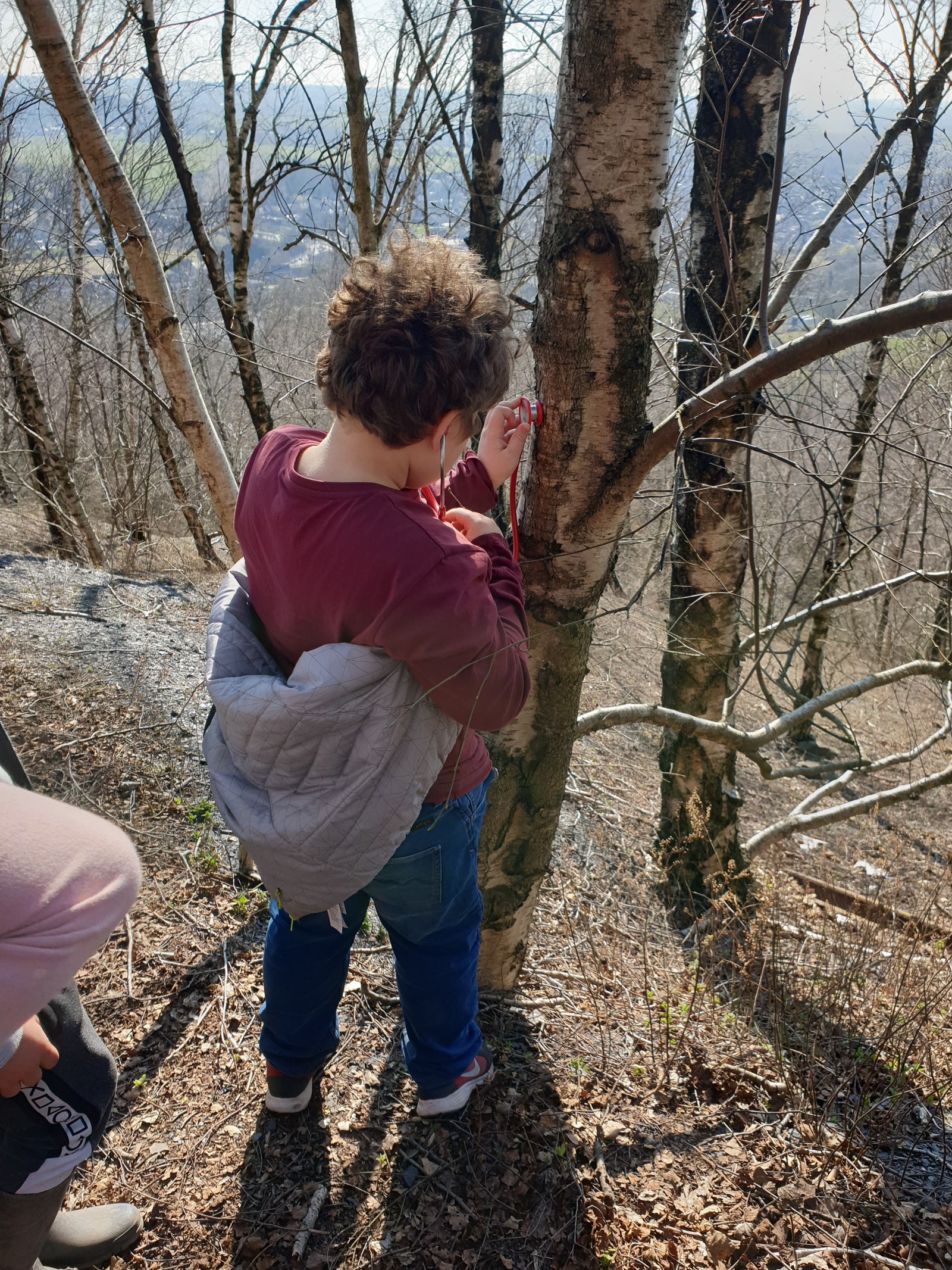 Surprise : on va jouer au docteur ! On va ausculter le tronc d’un bouleau avec un stéthoscope pour essayer d’entendre la sève couler. Mais ce n’est pas évident… Il y en a même un qui entend un aigle ; et le voilà parti au pays des Indiens.