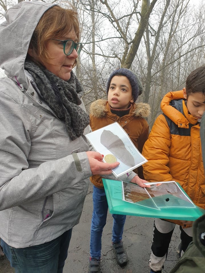 En haut du terril, on a parlé de la nature en hiver. La nature est au repos. Il n’y a presque pas de feuilles. On s’est tu, on a fermé les yeux et ouvert grand les oreilles, et on a entendu peu de sons dans la nature : 4. On les a imités : le bruit des voitures, le vent, un chant d’oiseau et un autre, Une mésange et une corneille. Il y avait des moustiques qui tournaient autour de nous, bizarre en plein hiver.