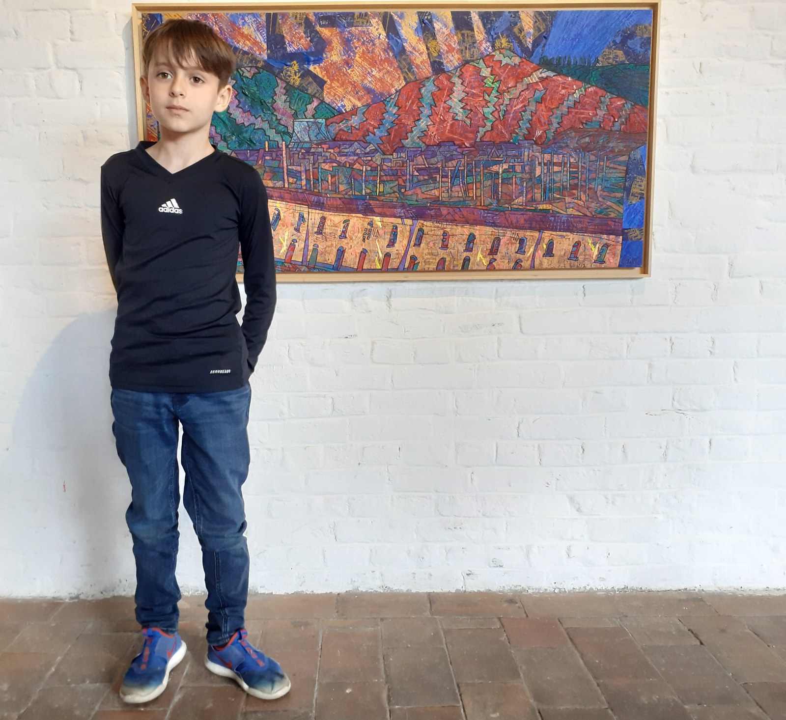 Avant d’entrer, les enfants me montrent les dessins qu’ils ont fait du terril. Certains se veulent fidèles, d’autres ont déjà mis leur petit grain d’imagination et de réappropriation. Alparslan par exemple y a parsemé plusieurs formes géométriques, Philippe a représenté un terril d’autrefois mêlé à un terril d’aujourd’hui. L’idéal pour expliquer que l’artiste nous donne à voir sa propre vision du monde et non la réalité telle qu’on pourrait la voir sur des photos. Dès l’entrée, ce sont des yeux émerveillés par toutes ces couleurs qui jaillissent au premier regard. J’explique que Daniel Pelletti est le voisin de leur école, qu’il a grandi dans ce paysage et qu’il le réinterprète à sa façon.