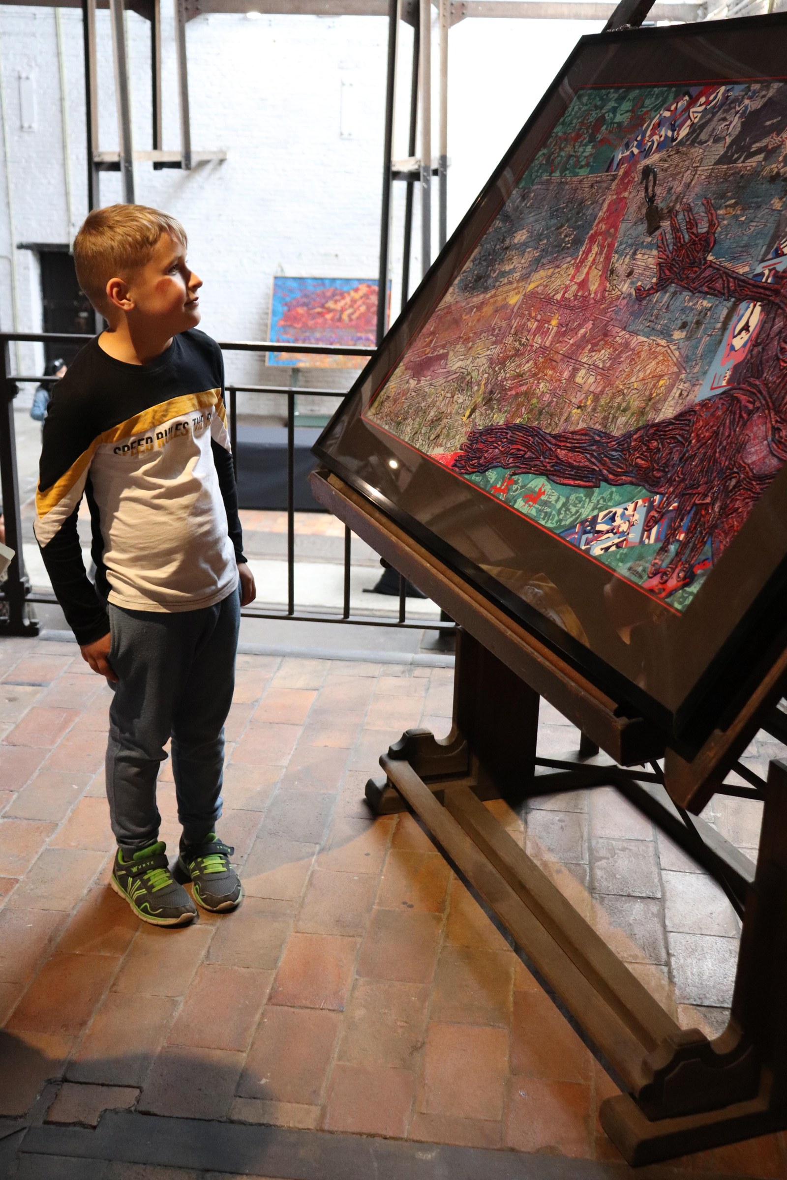 Le grand jour est arrivé : les enfants découvrent l’exposition de Daniel Pelletti. Un premier contact pour la plupart avec l’art ; la spontanéité est de mise en abordant les œuvres. Avant d’entrer quelques consignes s’imposent : sur le terril, on courait et on touchait tout ce qu’on voulait ; dans une exposition, on est calme, on se tient à distance des œuvres pour ne pas les abîmer. Deux univers complètement différents. Les enfants sont fiers : ils ont la chance de découvrir l’exposition en primeur, avant les journalistes et les autres visiteurs ! Ils ont également la chance de découvrir les coulisses du montage d’une exposition : les préparatifs ne sont pas encore tout à fait terminés.
