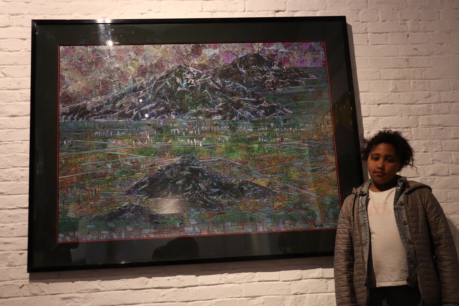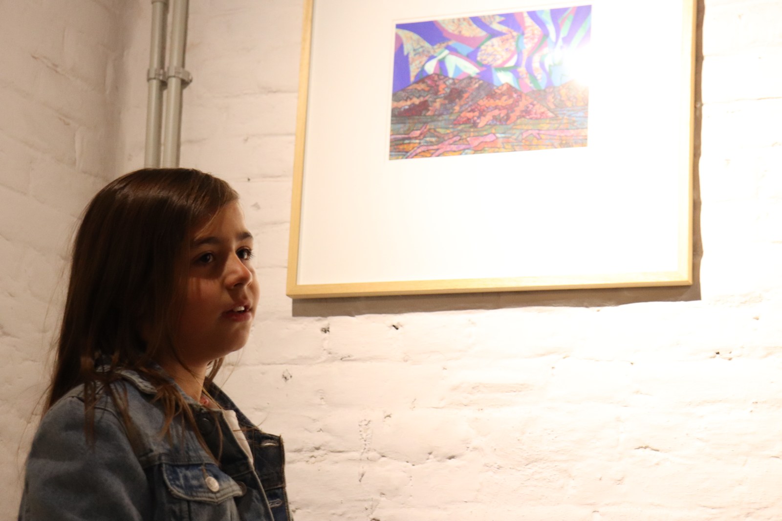 Maëlyne : « J’aime bien celui-ci parce qu’en bas, il a voulu montrer les couleurs qu’il a mises dans son tableau. Il y a des motifs qui font penser à de gros rochers, comme dans l’ancien temps ceux qui dessinaient dans les grottes »